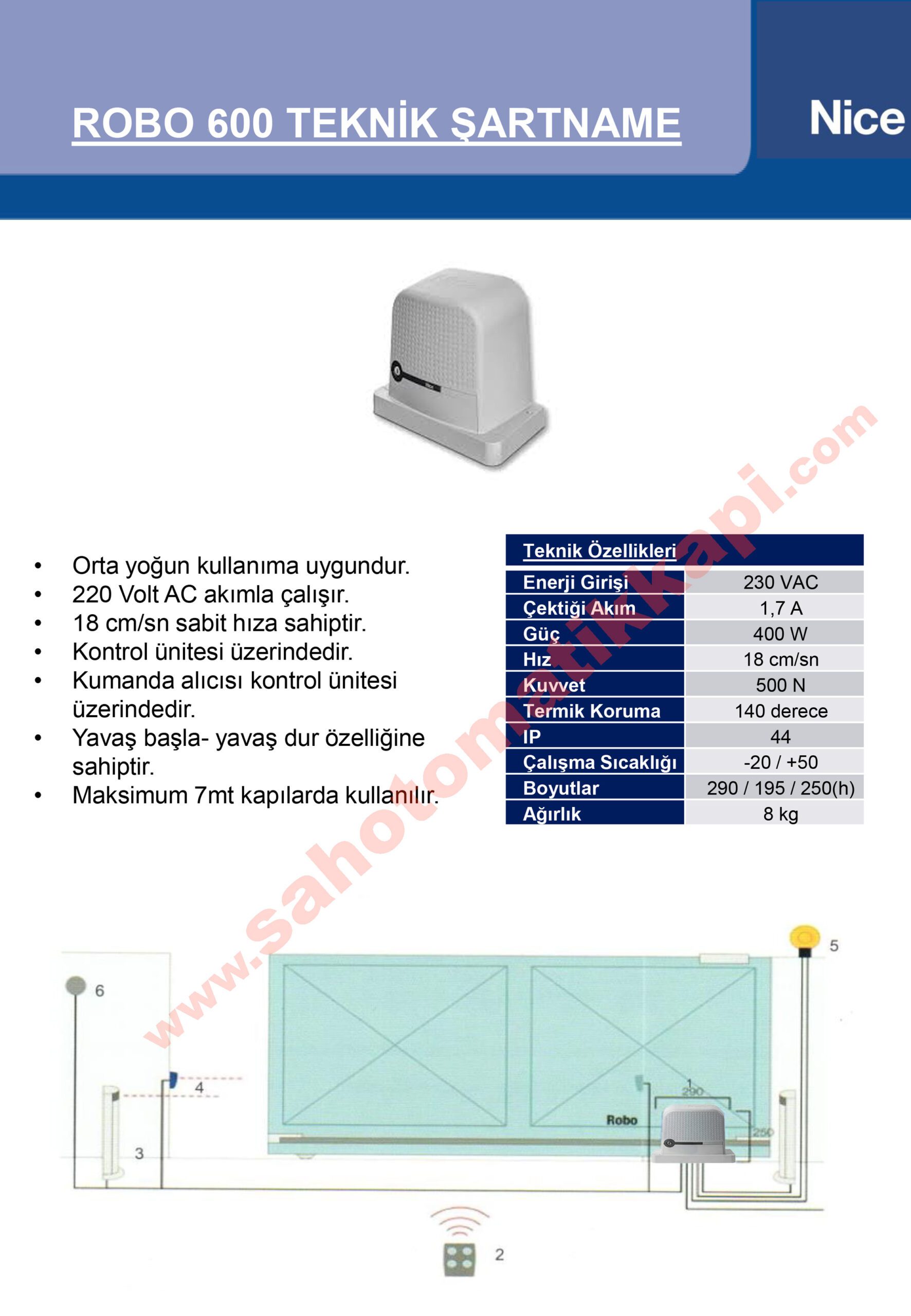 600 kg a kadar olan yanakayar kapılar içinNon-reversible, 230 VAC,
